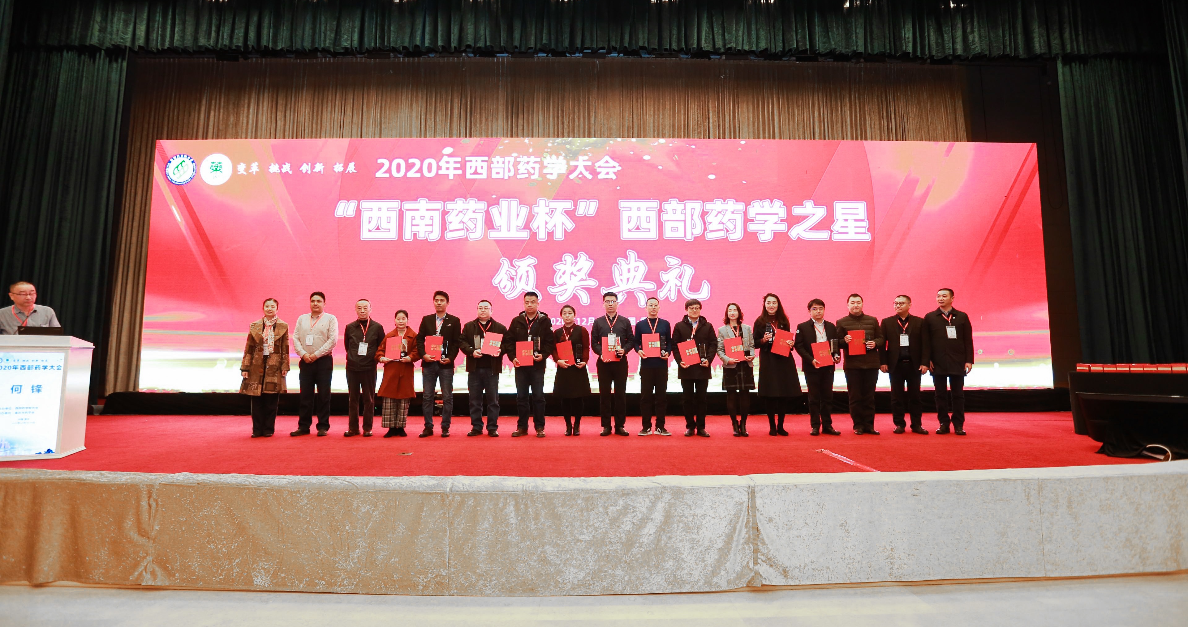 颁奖典礼上,来自贵州医科大学邓林教授等15位中青年药学专家荣获“西南药业杯”西部药学之星称号,西南药业党委书记、董事长鲜亚作为唯一的企业代表出席大会,与重庆市政协教科卫体委员会主任夏永鹏、重庆药学会理事长马琳、西部药学联合会主席丰雷、重庆市药品监督管理局副局长罗莉等领导一同为获奖专家颁奖并合影留念,将会议推上高潮。西部药学之星作为西部药学领域的先进代表,将共同为中国西部药学发展开辟一片新天地。