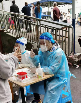 “临时通知,希望大家理解!”11月15日,秦鹏巍扯着嗓子无数次地重复这句话,显然,今天的工作让他感到有些焦急。由于当天的核酸是临时通知的,三人成虎,“惧阳”的恐慌情绪在居民之间蔓延开来。秦鹏巍穿上隔离衣,戴上胶手套,用酒精全身消毒后,开始在搭建的临时核酸点组织居民排队核酸。正常情况下,秦鹏巍每天平均扫码700余人,今天聚集人数逐渐增多,任务更加繁重。他一边要帮老年人调出核酸码,一边要安抚居民情绪,一边还要录入核酸信息,大颗大颗的汗水干扰着他的视线,饥饿感也伴随来临。但穿上“大白战衣”,便意味着责任与使命,一定要保持微笑、热情与耐心。他说:“我要求自己,不能有一丝的不耐烦,必须耐心的向居民解释,我的言谈举止关系着西南药业的形象。”